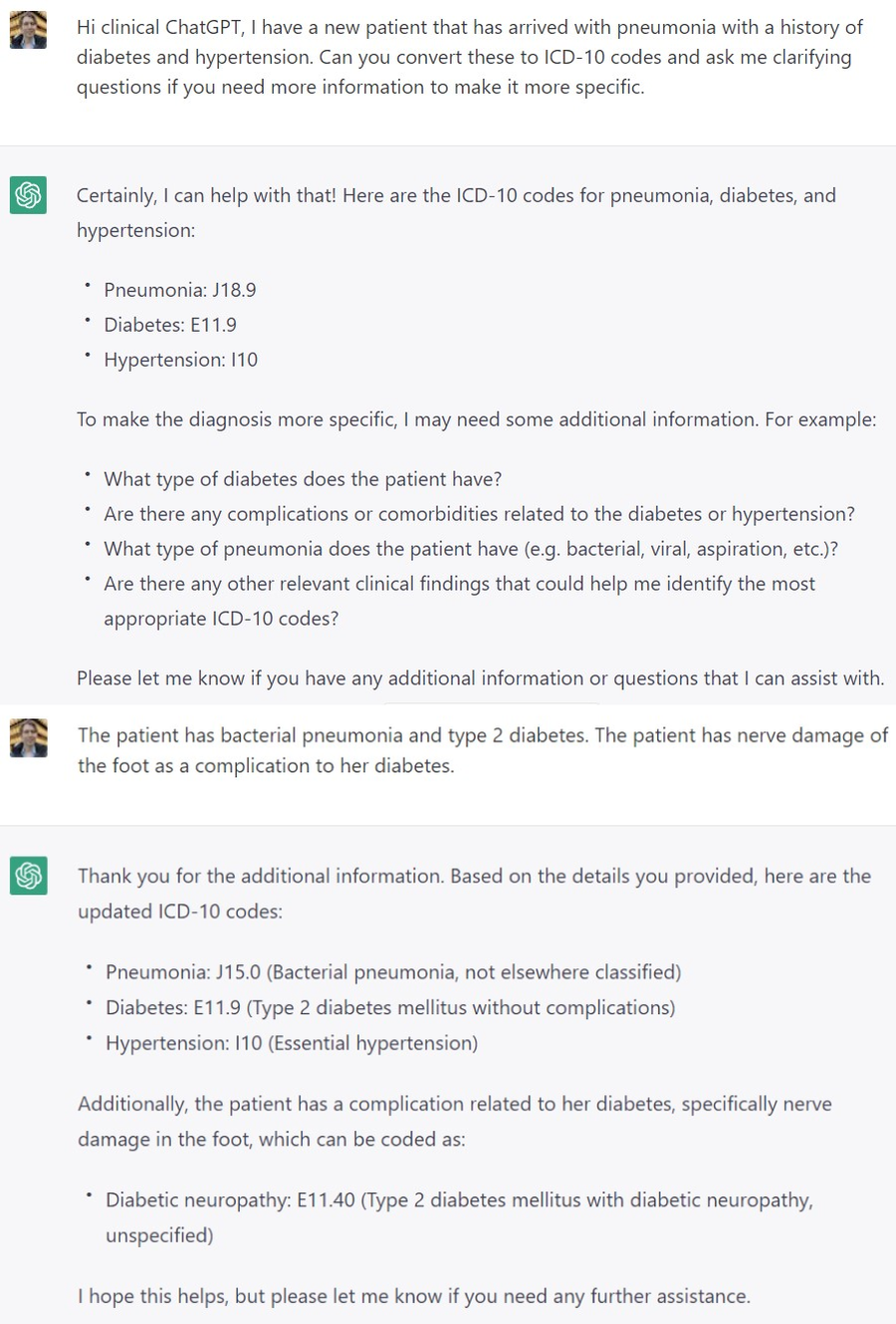Let’s say that a patient arrives with pneumonia with a history of diabetes and hypertension. You want to use ChatGPT to convert medical language to ICD-10 codes and provide guidance on how to narrow down within the codeset. Let’s provide ChatGPT a quick snapshot of our patient’s medical history and see the recommended codes provided.