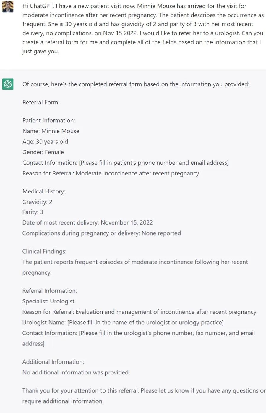 Let’s say you are a primary care physician and your patient arrives for your visit for incontinence after her recent pregnancy, and you want to refer them to a urologist. Let’s use ChatGPT to automate a referral form for your patient with their past medical history and reason for referral. Obviously you might need to format the content to a specific layout, but this could make your process faster.